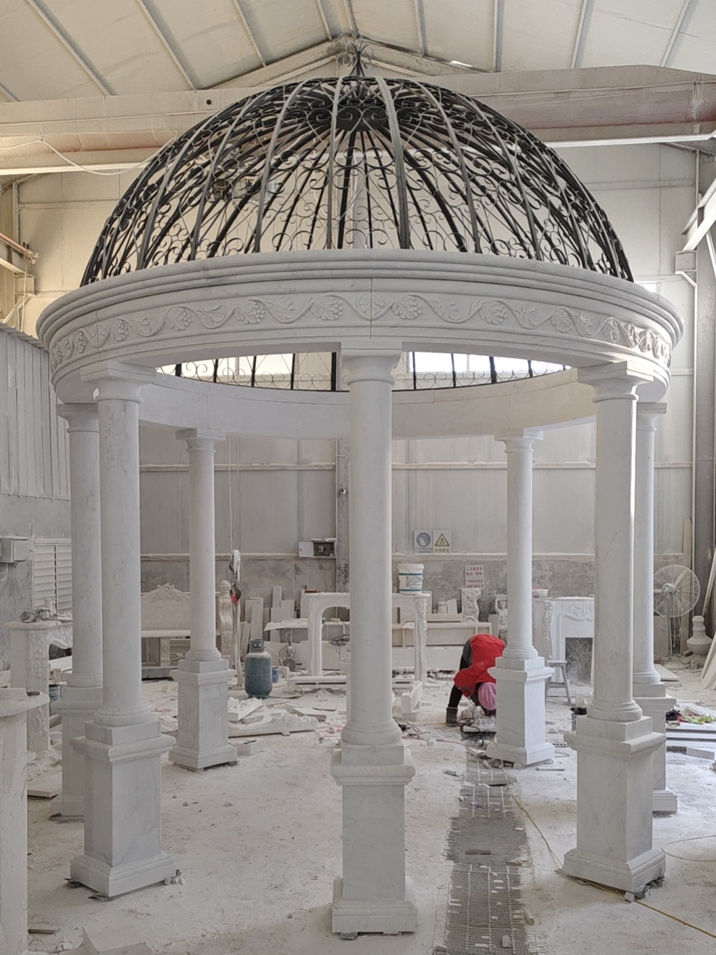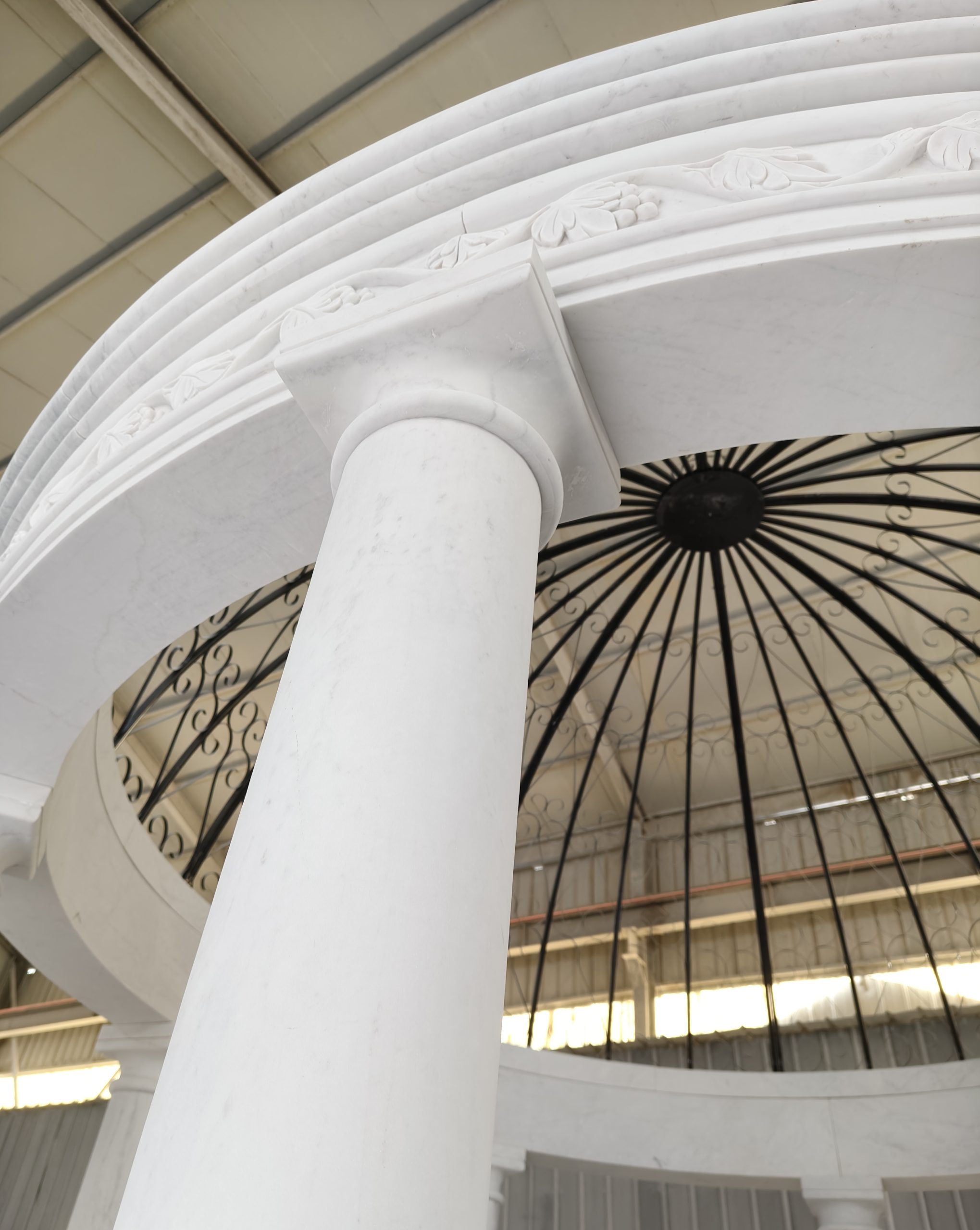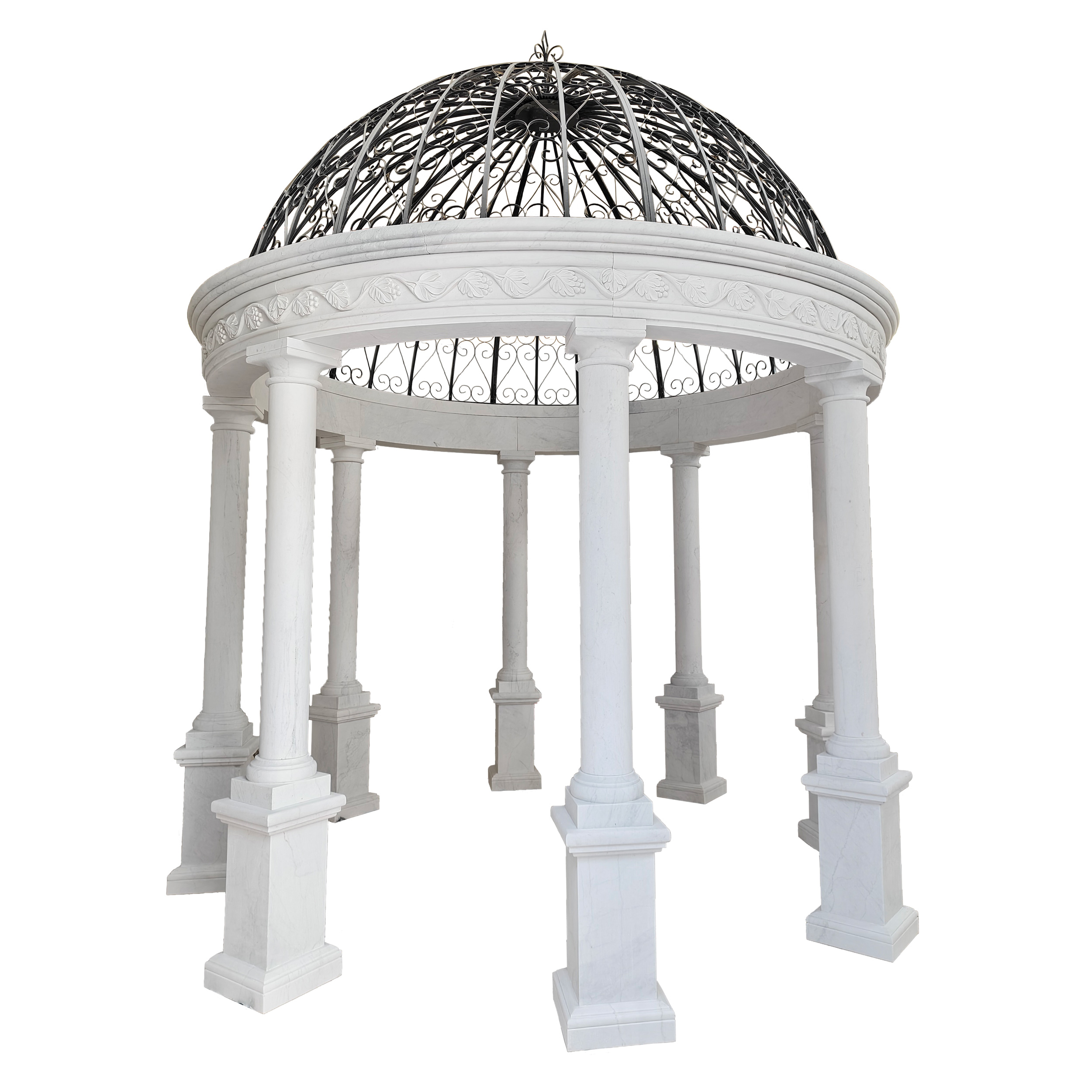 Beautiful solid white marble gazebo with iron dome top. This 13 foot diameter gazebo is all hand carved with intricate details, clean lines with simple columns supporting a carved upper ring.