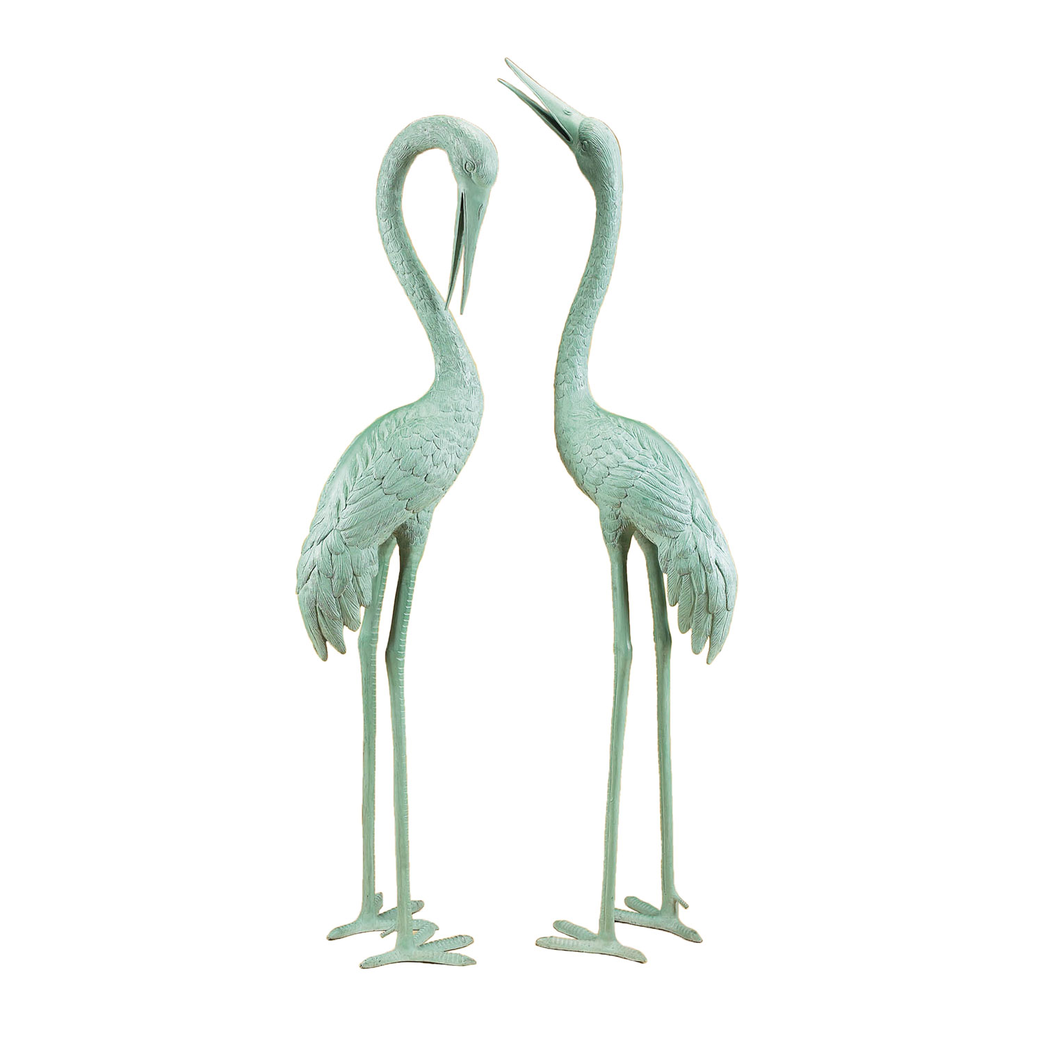 Large pair of bronze cranes, 71 inches tall with water shooting from the mouth of each crane. Available in brown or green finish.