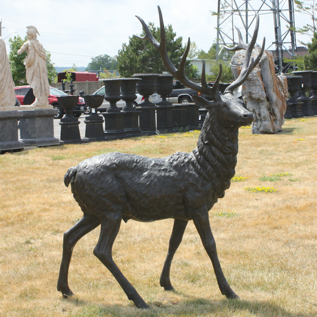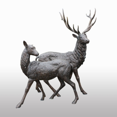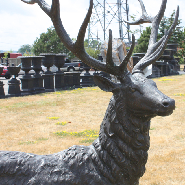 Very large pair of bronze life size deer garden statues. Buck is also available by itself. See A6311AC/1 for male deer only. Male is 63″ x 36″ x 104″H, female is 55″ x 18″ x 56″H.