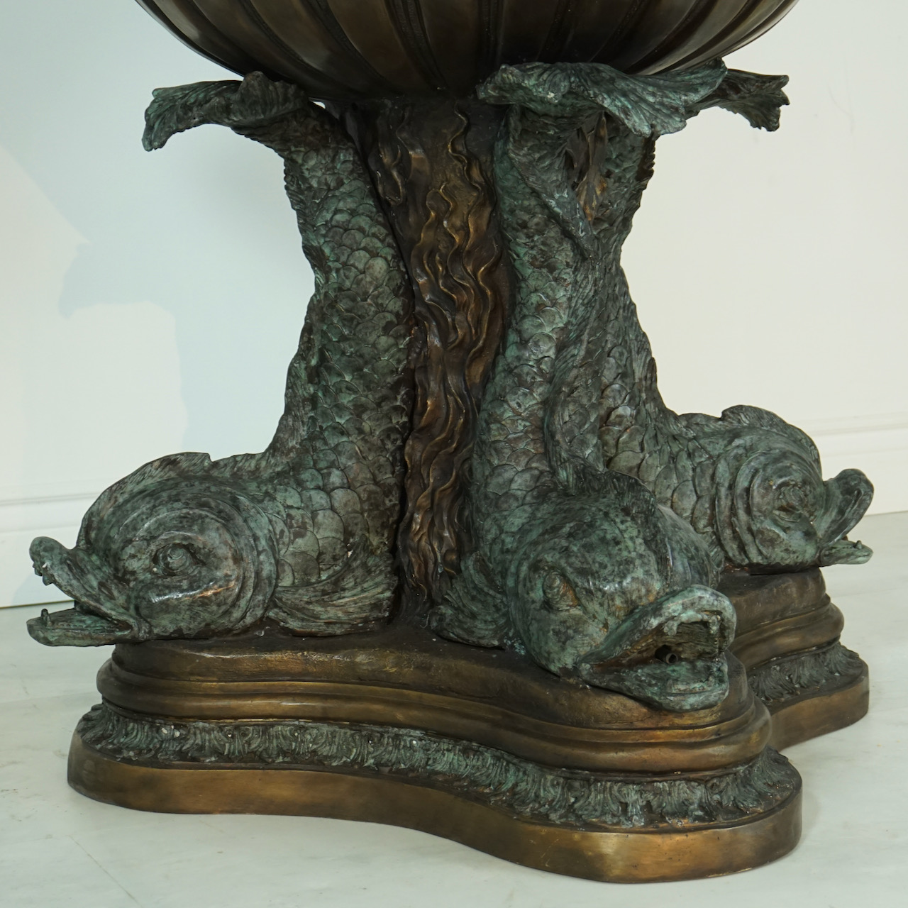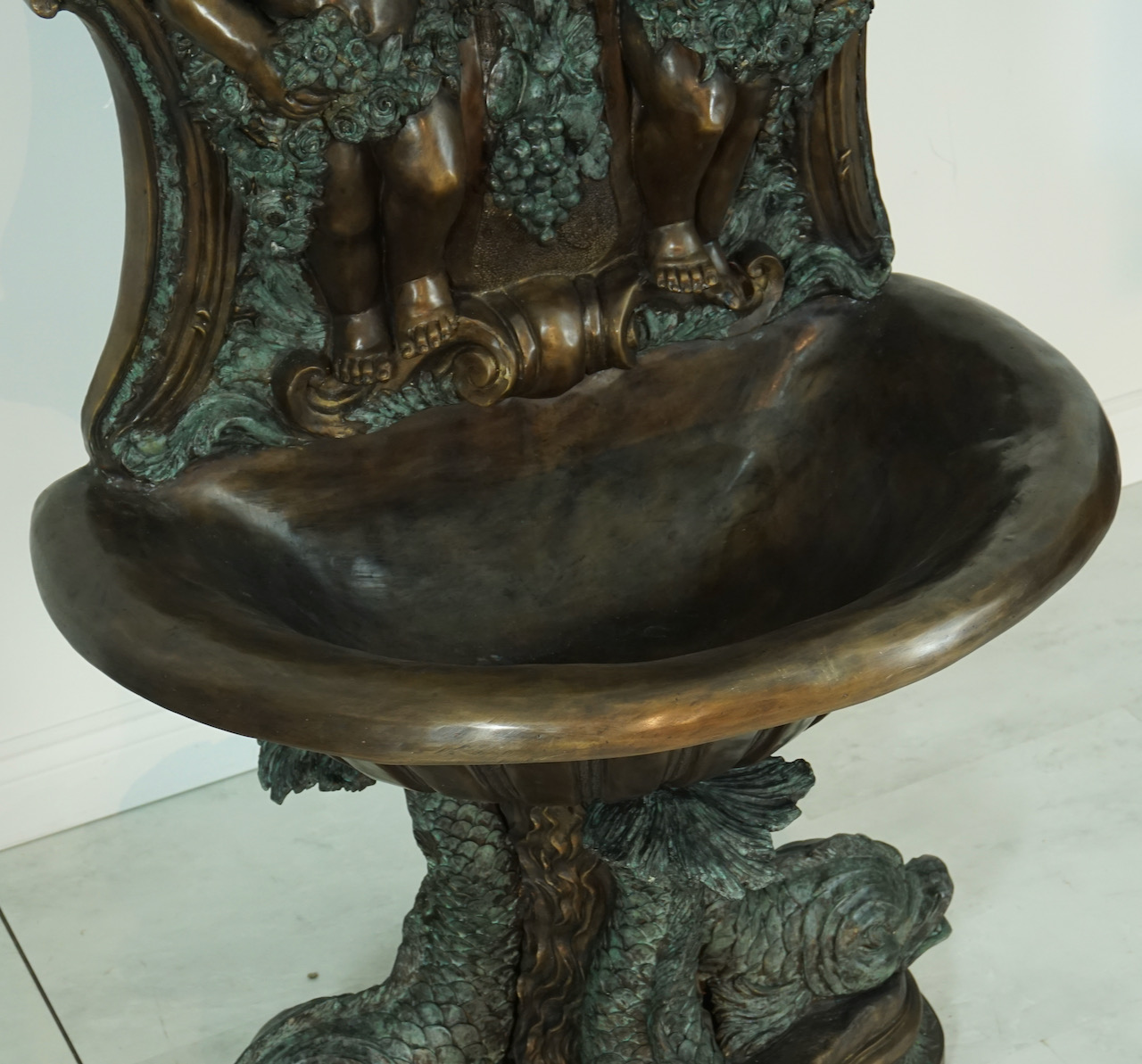 Stunning wall fountain, featuring a lion head at the top with a spout in the mouth, two cherubs on either side, and 3 fish at the base, each with a spout in the mouth. Water flows from the lion mouth into the main bowl which overflows, and also shoots out from each of the 3 fish in the base. This made of bronze, in a two tone finish.